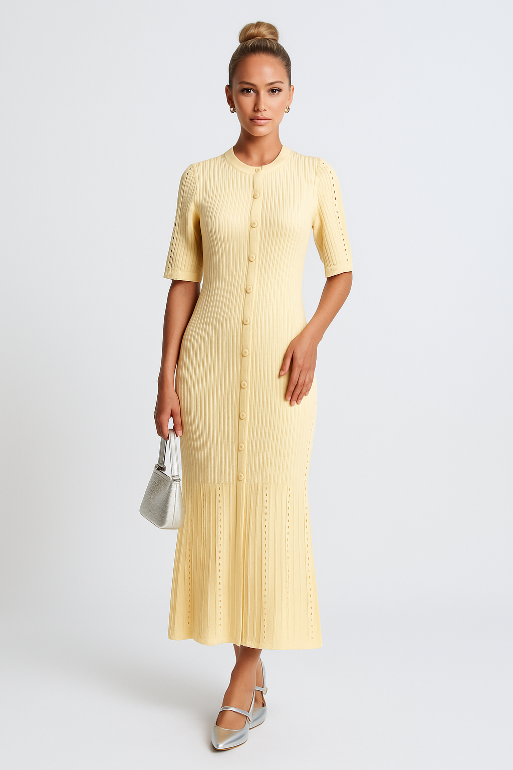 • Design: Enganliegendes Midi-Kleid mit klaren Linien und rundem Ausschnitt